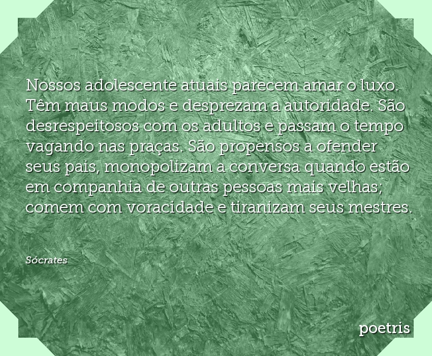 Nossos adolescente atuais parecem amar o luxo. Têm maus modos e desprezam a autoridade. São desrespeitosos com os adultos e passam o tempo vagando nas praças. São propensos a ofender seus pais, monopolizam a conversa quando estão em companhia de outras pessoas mais velhas; comem com voracidade e tiranizam seus mestres.