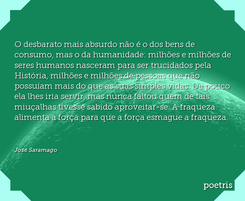 O desbarato mais absurdo não é o dos bens de consumo, mas o da humanidade: milhões e milhões de seres humanos nasceram para ser trucidados pela História, milhões e milhões de pessoas que não possuíam mais do que as suas simples vidas. De pouco ela lhes iria servir, mas nunca faltou quem de tais miuçalhas tivesse sabido aproveitar-se. A fraqueza alimenta a força para que a força esmague a fraqueza.