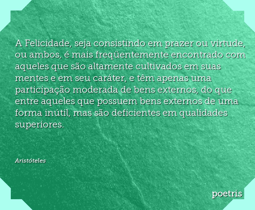 A Felicidade, seja consistindo em prazer ou virtude, ou ambos, é mais freqüentemente encontrado com aqueles que são altamente cultivados em suas mentes e em seu caráter, e têm apenas uma participação moderada de bens externos, do que entre aqueles que possuem bens externos de uma forma inútil, mas são deficientes em qualidades superiores.