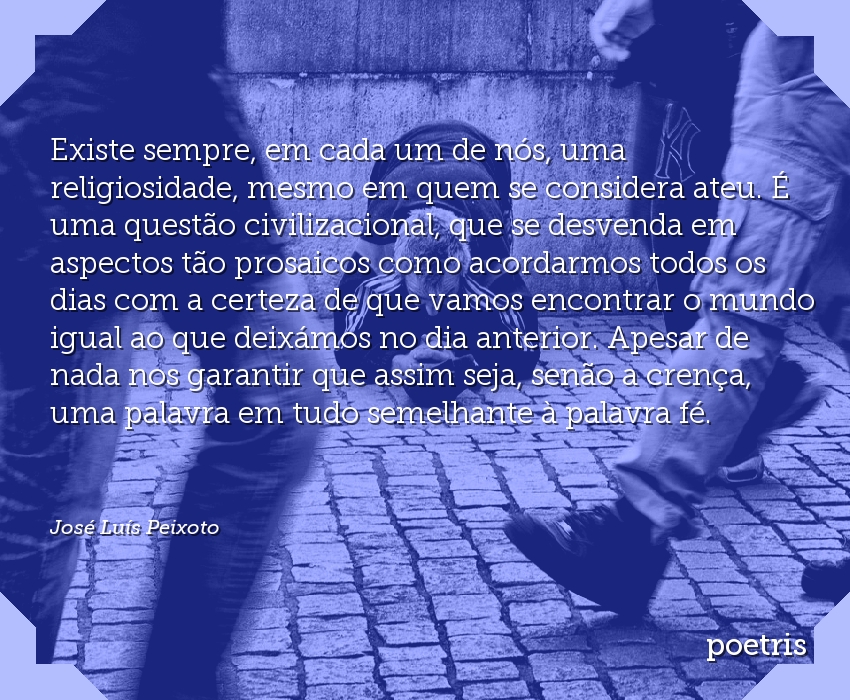 Existe sempre, em cada um de nós, uma religiosidade, mesmo em quem se considera ateu. É uma questão civilizacional, que se desvenda em aspectos tão prosaicos como acordarmos todos os dias com a certeza de que vamos encontrar o mundo igual ao que deixámos no dia anterior. Apesar de nada nos garantir que assim seja, senão a crença, uma palavra em tudo semelhante à palavra fé.