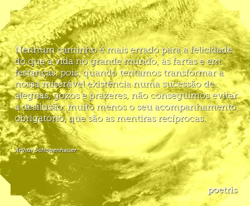 Nenhum caminho é mais errado para a felicidade do que a vida no grande mundo, às fartas e em festanças, pois, quando tentamos transformar a nossa miserável existência numa sucessão de alegrias, gozos e prazeres, não conseguimos evitar a desilusão; muito menos o seu acompanhamento obrigatório, que são as mentiras recíprocas.