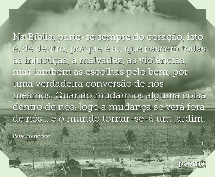 Na Bíblia, parte-se sempre do coração, isto é, de dentro, porque é ali que nascem todas as injustiças, a malvadez, as violências, mas também as escolhas pelo bem, por uma verdadeira conversão de nós mesmos. Quando mudarmos alguma coisa dentro de nós, logo a mudança se verá fora de nós… e o mundo tornar-se-á um jardim.