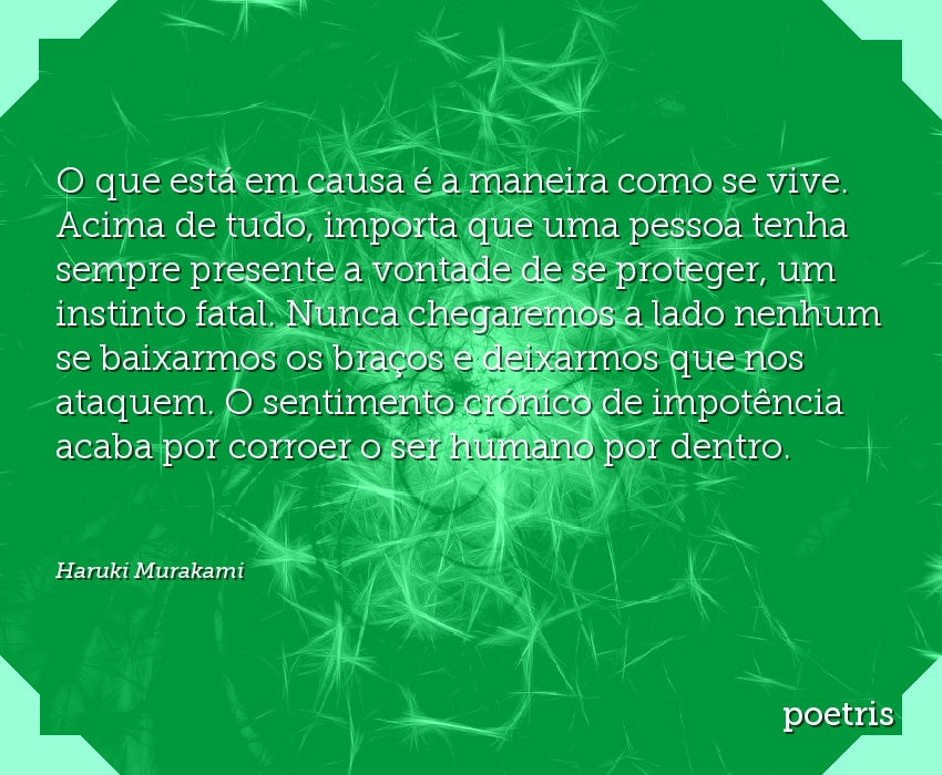 O que está em causa é a maneira como se vive. Acima de tudo, importa que uma pessoa tenha sempre presente a vontade de se proteger, um instinto fatal. Nunca chegaremos a lado nenhum se baixarmos os braços e deixarmos que nos ataquem. O sentimento crónico de impotência acaba por corroer o ser humano por dentro.