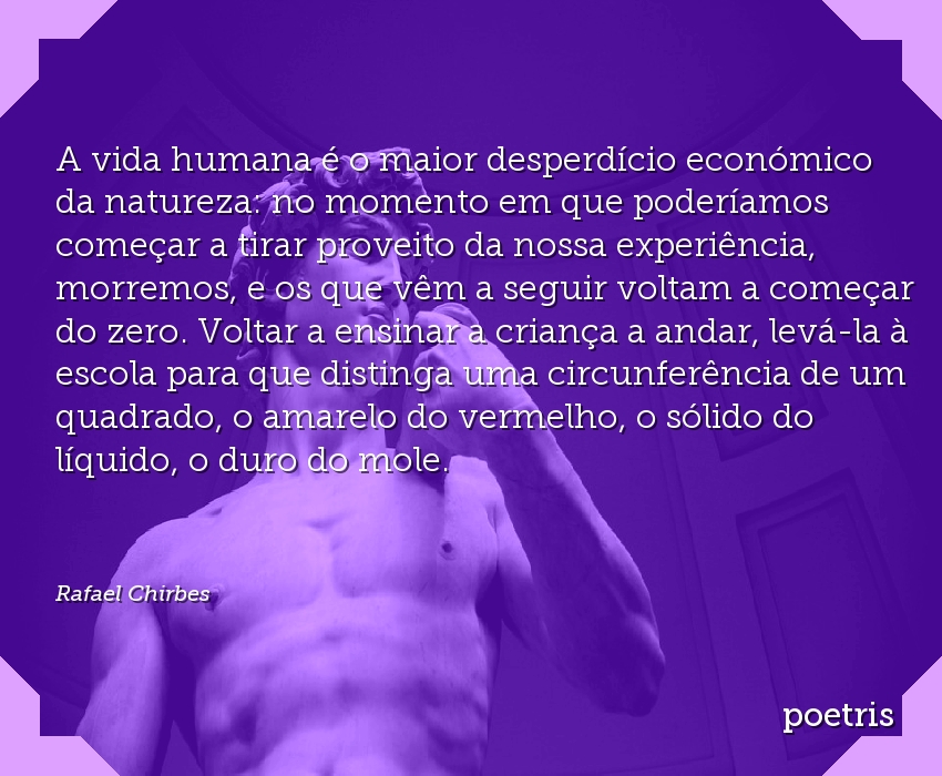 A vida humana é o maior desperdício económico da natureza: no momento em que poderíamos começar a tirar proveito da nossa experiência, morremos, e os que vêm a seguir voltam a começar do zero. Voltar a ensinar a criança a andar, levá-la à escola para que distinga uma circunferência de um quadrado, o amarelo do vermelho, o sólido do líquido, o duro do mole.