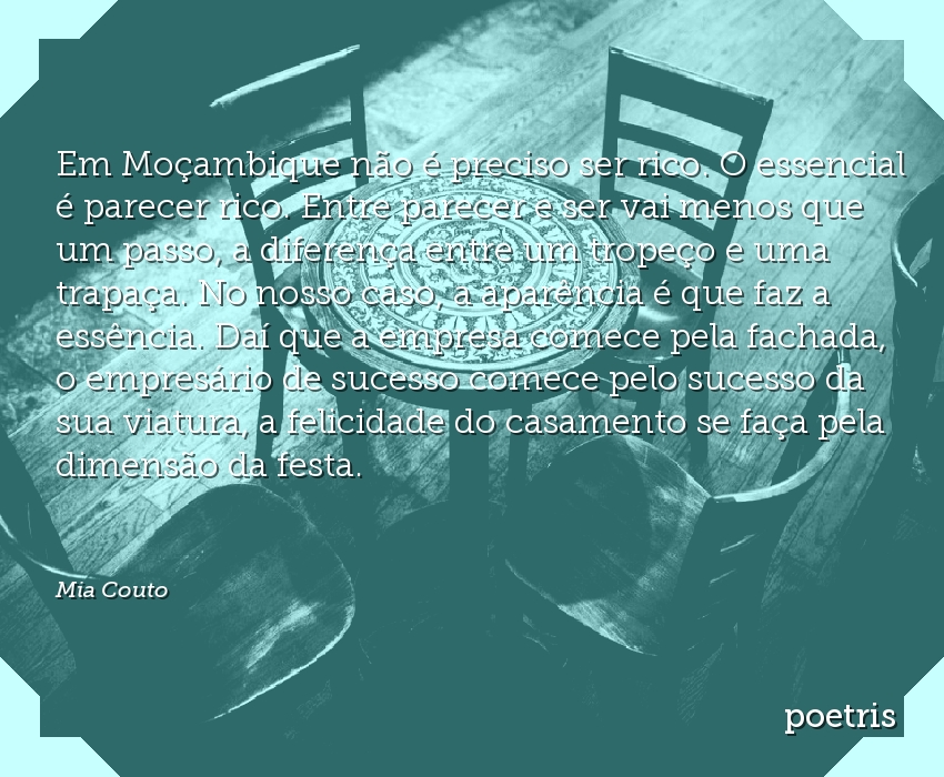 Em Moçambique não é preciso ser rico. O essencial é parecer rico. Entre parecer e ser vai menos que um passo, a diferença entre um tropeço e uma trapaça. No nosso caso, a aparência é que faz a essência. Daí que a empresa comece pela fachada, o empresário de sucesso comece pelo sucesso da sua viatura, a felicidade do casamento se faça pela dimensão da festa.