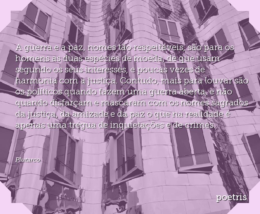 A guerra e a paz, nomes tão respeitáveis, são para os homens as duas espécies de moeda, de que usam segundo os seus interesses, e poucas vezes de harmonia com a justiça. Contudo, mais para louvar são os políticos quando fazem uma guerra aberta, e não quando disfarçam e mascaram com os nomes sagrados da justiça, da amizade e da paz o que na realidade é apenas uma trégua de inquietações e de crimes.