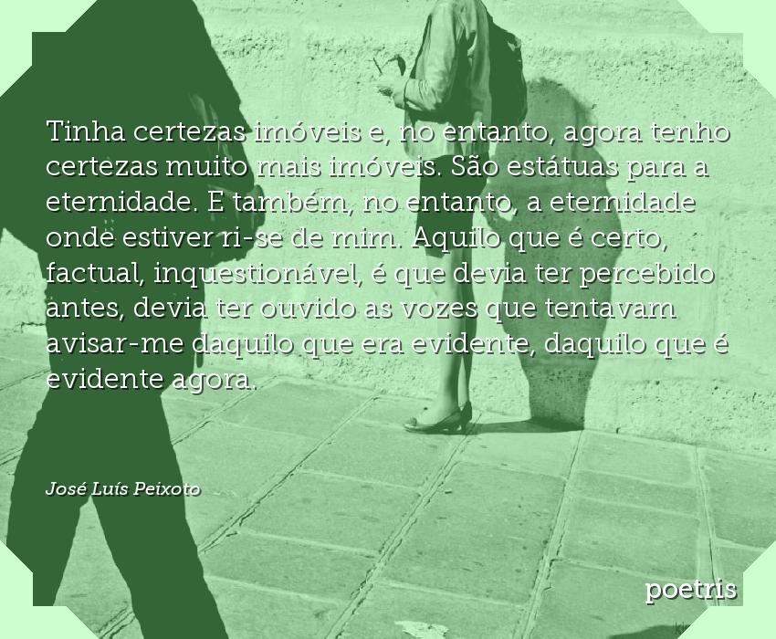 Tinha certezas imóveis e, no entanto, agora tenho certezas muito mais imóveis. São estátuas para a eternidade. E também, no entanto, a eternidade onde estiver ri-se de mim. Aquilo que é certo, factual, inquestionável, é que devia ter percebido antes, devia ter ouvido as vozes que tentavam avisar-me daquilo que era evidente, daquilo que é evidente agora.