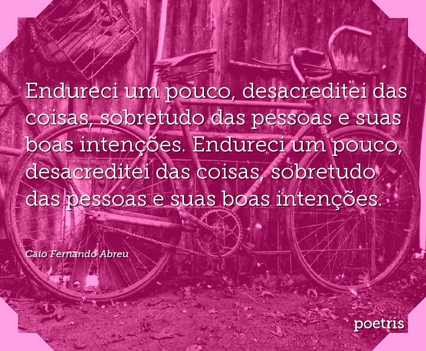 Endureci um pouco, desacreditei das coisas, sobretudo das pessoas e suas boas intenções. Endureci um pouco, desacreditei das coisas, sobretudo das pessoas e suas boas intenções.