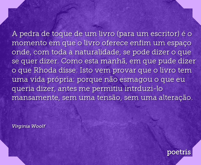 A pedra de toque de um livro (para um escritor) é o momento em que o livro oferece enfim um espaço onde, com toda a naturalidade, se pode dizer o que se quer dizer. Como esta manhã, em que pude dizer o que Rhoda disse. Isto vem provar que o livro tem uma vida própria: porque não esmagou o que eu queria dizer, antes me permitiu intrduzi-lo mansamente, sem uma tensão, sem uma alteração.