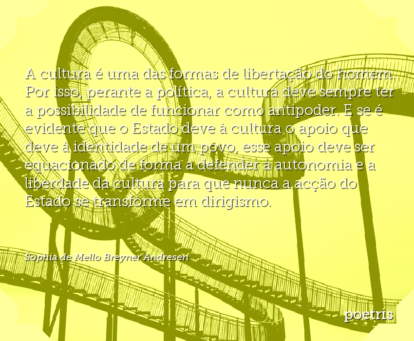 A cultura é uma das formas de libertação do homem. Por isso, perante a política, a cultura deve sempre ter a possibilidade de funcionar como antipoder. E se é evidente que o Estado deve à cultura o apoio que deve à identidade de um povo, esse apoio deve ser equacionado de forma a defender a autonomia e a liberdade da cultura para que nunca a acção do Estado se transforme em dirigismo.