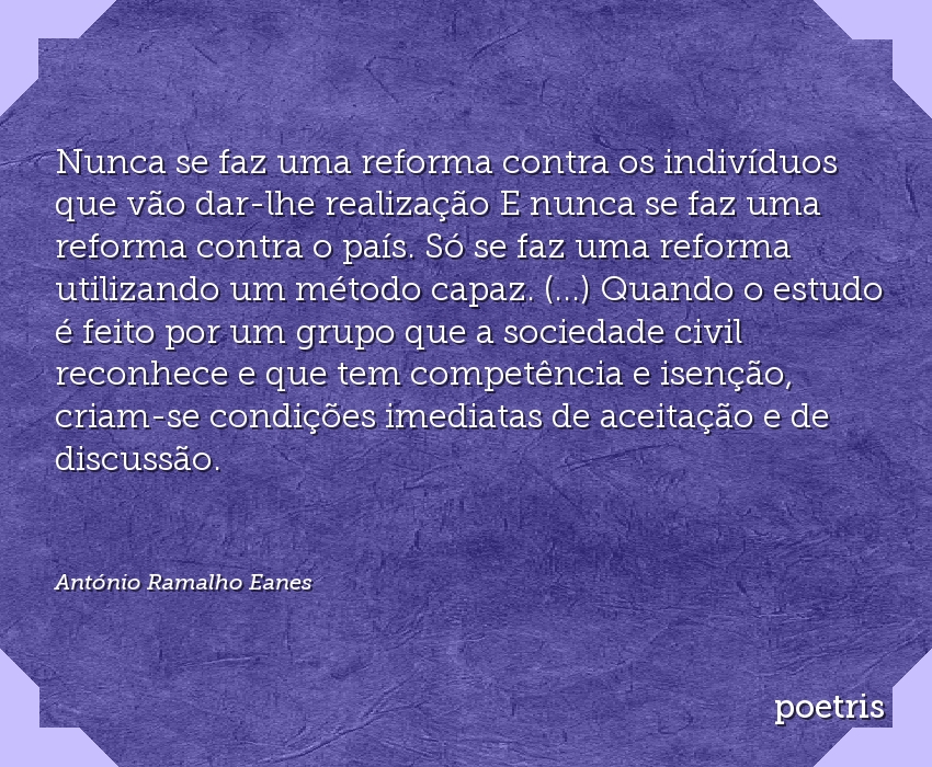 Nunca se faz uma reforma contra os indivíduos que vão dar-lhe realização E nunca se faz uma reforma contra o país. Só se faz uma reforma utilizando um método capaz. (…) Quando o estudo é feito por um grupo que a sociedade civil reconhece e que tem competência e isenção, criam-se condições imediatas de aceitação e de discussão.