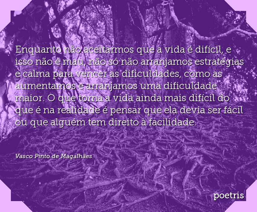 Enquanto não aceitarmos que a vida é difícil, e isso não é mau, não só não arranjamos estratégias e calma para vencer as dificuldades, como as aumentamos e arranjamos uma dificuldade maior. O que torna a vida ainda mais difícil do que é na realidade é pensar que ela devia ser fácil ou que alguém tem direito à facilidade.