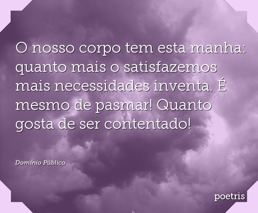 O nosso corpo tem esta manha: quanto mais o satisfazemos mais necessidades inventaO nosso corpo tem esta manha: quanto mais o satisfazemos mais necessidades inventa. É mesmo de pasmar! Quanto gosta de ser contentado!