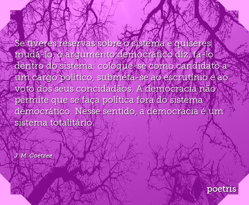 Se tiveres reservas sobre o sistema e quiseres mudá-lo, o argumento democrático diz, fá-lo dentro do sistema: coloque-se como candidato a um cargo político, submeta-se ao escrutínio e ao voto dos seus concidadãos. A democracia não permite que se faça política fora do sistema democrático. Nesse sentido, a democracia é um sistema totalitário.