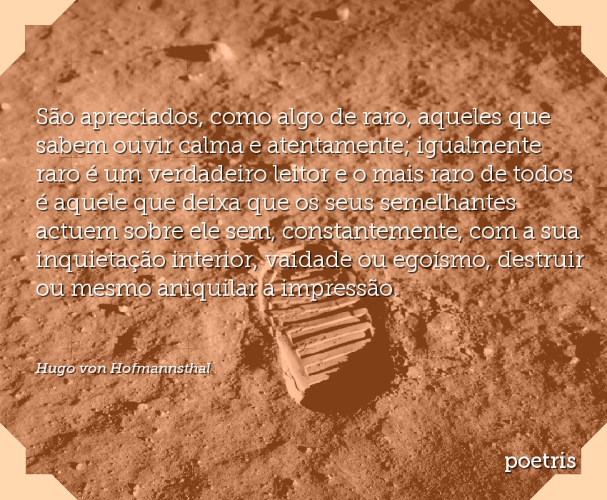São apreciados, como algo de raro, aqueles que sabem ouvir calma e atentamente; igualmente raro é um verdadeiro leitor e o mais raro de todos é aquele que deixa que os seus semelhantes actuem sobre ele sem, constantemente, com a sua inquietação interior, vaidade ou egoísmo, destruir ou mesmo aniquilar a impressão.