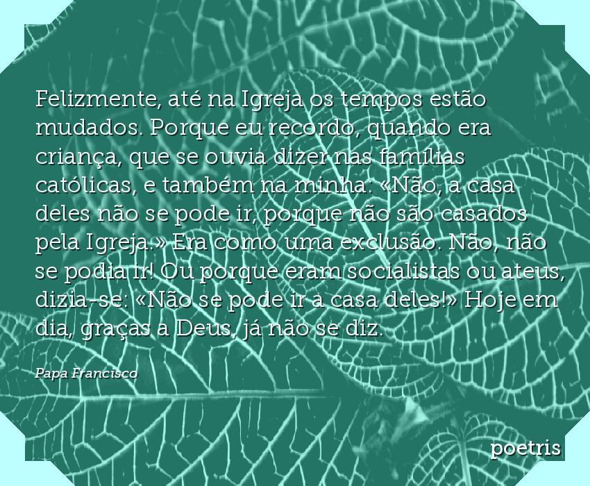 Felizmente, até na Igreja os tempos estão mudados. Porque eu recordo, quando era criança, que se ouvia dizer nas famílias católicas, e também na minha: «Não, a casa deles não se pode ir, porque não são casados pela Igreja.» Era como uma exclusão. Não, não se podia ir! Ou porque eram socialistas ou ateus, dizia-se: «Não se pode ir a casa deles!» Hoje em dia, graças a Deus, já não se diz.
