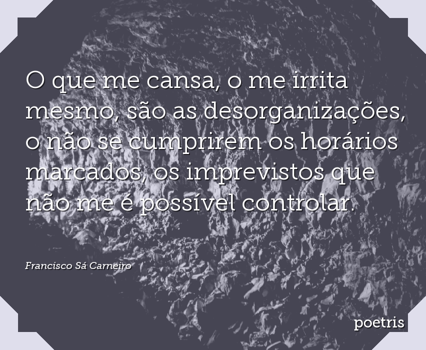 O que me cansa, o me irrita mesmo, são as desorganizações, o não se cumprirem os horários marcados, os imprevistos que não me é possível controlar.