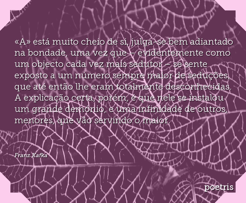 «A» está muito cheio de si, julga-se bem adiantado na bondade, uma vez que – evidentemente como um objecto cada vez mais sedutor – se sente exposto a um número sempre maior de seduções, que até então lhe eram totalmente desconhecidas. A explicação certa, porém, é que nele se instalou um grande demónio, e uma infinidade de outros, menores, que vão servindo o maior.