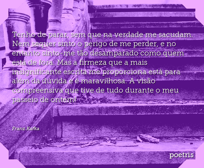 Tenho de parar, sem que na verdade me sacudam. Nem sequer sinto o perigo de me perder, e no entanto sinto-me tão desamparado como quem está de fora. Mas a firmeza que a mais insignificante escrita me proporciona está para além da dúvida e é maravilhosa. A visão compreensiva que tive de tudo durante o meu passeio de ontem!