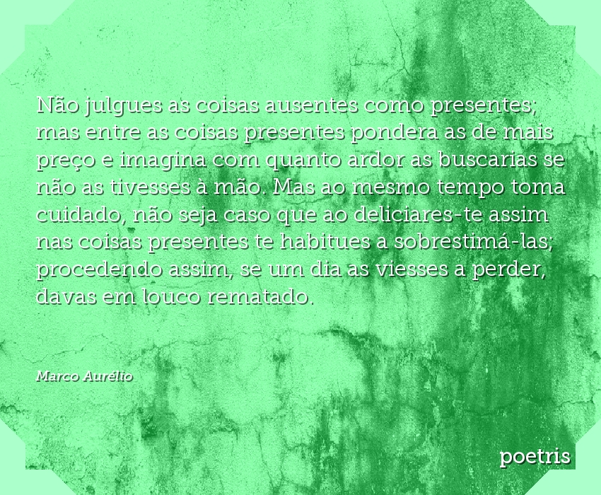 Não julgues as coisas ausentes como presentes; mas entre as coisas presentes pondera as de mais preço e imagina com quanto ardor as buscarias se não as tivesses à mão. Mas ao mesmo tempo toma cuidado, não seja caso que ao deliciares-te assim nas coisas presentes te habitues a sobrestimá-las; procedendo assim, se um dia as viesses a perder, davas em louco rematado.