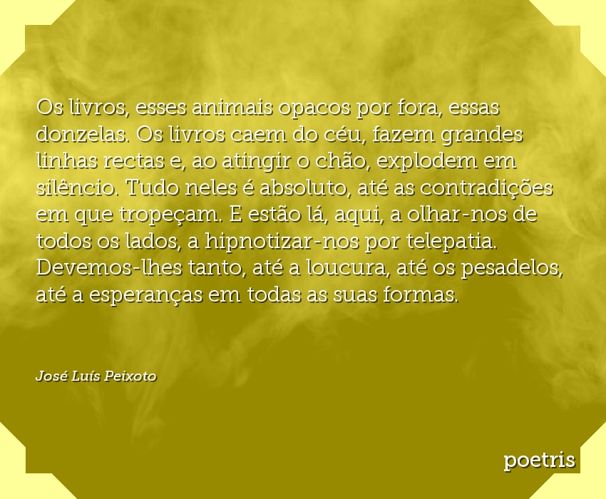 Os livros, esses animais opacos por fora, essas donzelas. Os livros caem do céu, fazem grandes linhas rectas e, ao atingir o chão, explodem em silêncio. Tudo neles é absoluto, até as contradições em que tropeçam. E estão lá, aqui, a olhar-nos de todos os lados, a hipnotizar-nos por telepatia. Devemos-lhes tanto, até a loucura, até os pesadelos, até a esperanças em todas as suas formas.