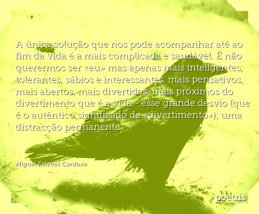A única solução que nos pode acompanhar até ao fim da vida é a mais complicada e saudável. É não querermos ser «eu» mas apenas mais inteligentes, tolerantes, sábios e interessantes; mais pensativos, mais abertos, mais divertidos, mais próximos do divertimento que é a vida – esse grande desvio (que é o autêntico significado de «divertimento»); uma distracção permanente.