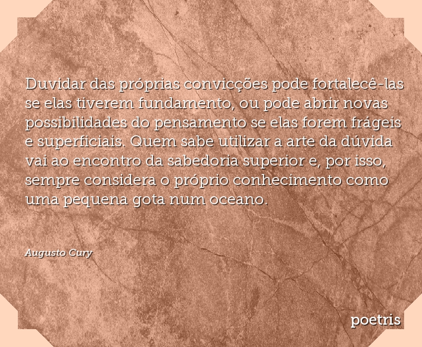 Duvidar das próprias convicções pode fortalecê-las se elas tiverem fundamento, ou pode abrir novas possibilidades do pensamento se elas forem frágeis e superficiais. Quem sabe utilizar a arte da dúvida vai ao encontro da sabedoria superior e, por isso, sempre considera o próprio conhecimento como uma pequena gota num oceano.