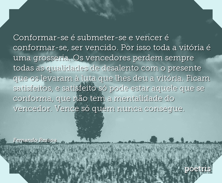 Conformar-se é submeter-se e vencer é conformar-se, ser vencido. Por isso toda a vitória é uma grosseria. Os vencedores perdem sempre todas as qualidades de desalento com o presente que os levaram à luta que lhes deu a vitória. Ficam satisfeitos, e satisfeito só pode estar aquele que se conforma, que não tem a mentalidade do vencedor. Vence só quem nunca consegue.