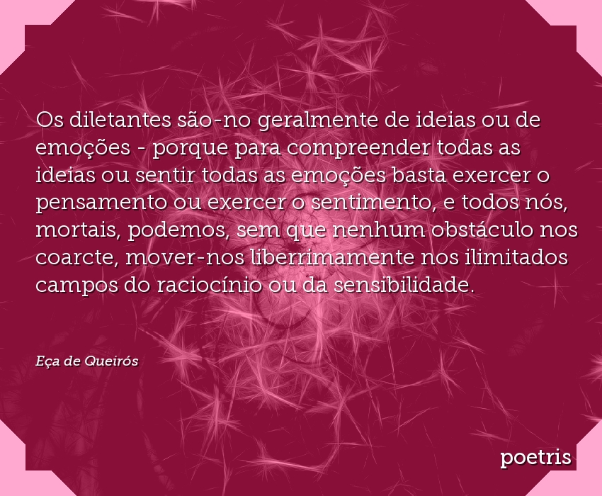 Os diletantes são-no geralmente de ideias ou de emoções – porque para compreender todas as ideias ou sentir todas as emoções basta exercer o pensamento ou exercer o sentimento, e todos nós, mortais, podemos, sem que nenhum obstáculo nos coarcte, mover-nos liberrimamente nos ilimitados campos do raciocínio ou da sensibilidade.