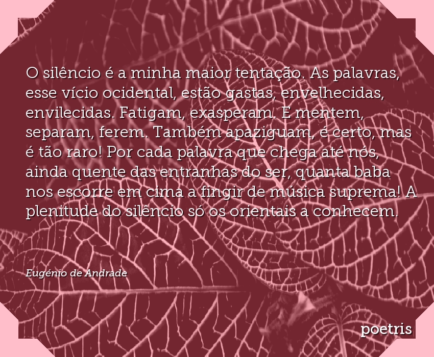O silêncio é a minha maior tentação. As palavras, esse vício ocidental, estão gastas, envelhecidas, envilecidas. Fatigam, exasperam. E mentem, separam, ferem. Também apaziguam, é certo, mas é tão raro! Por cada palavra que chega até nós, ainda quente das entranhas do ser, quanta baba nos escorre em cima a fingir de música suprema! A plenitude do silêncio só os orientais a conhecem.