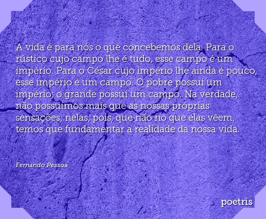 A vida é para nós o que concebemos dela. Para o rústico cujo campo lhe é tudo, esse campo é um império. Para o César cujo império lhe ainda é pouco, esse império é um campo. O pobre possui um império; o grande possui um campo. Na verdade, não possuímos mais que as nossas próprias sensações; nelas, pois, que não no que elas vêem, temos que fundamentar a realidade da nossa vida.