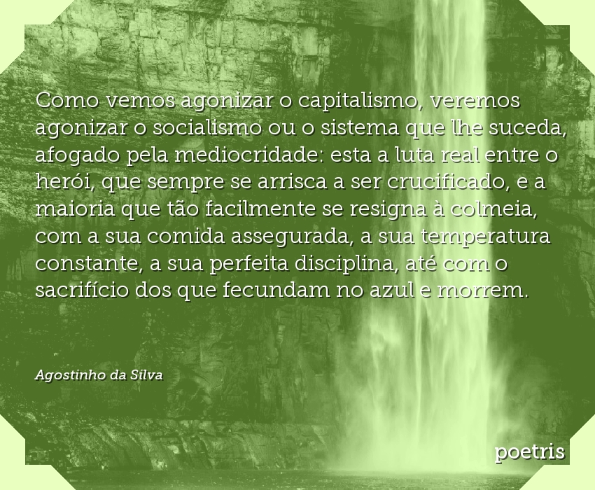 Como vemos agonizar o capitalismo, veremos agonizar o socialismo ou o sistema que lhe suceda, afogado pela mediocridade: esta a luta real entre o herói, que sempre se arrisca a ser crucificado, e a maioria que tão facilmente se resigna à colmeia, com a sua comida assegurada, a sua temperatura constante, a sua perfeita disciplina, até com o sacrifício dos que fecundam no azul e morrem.